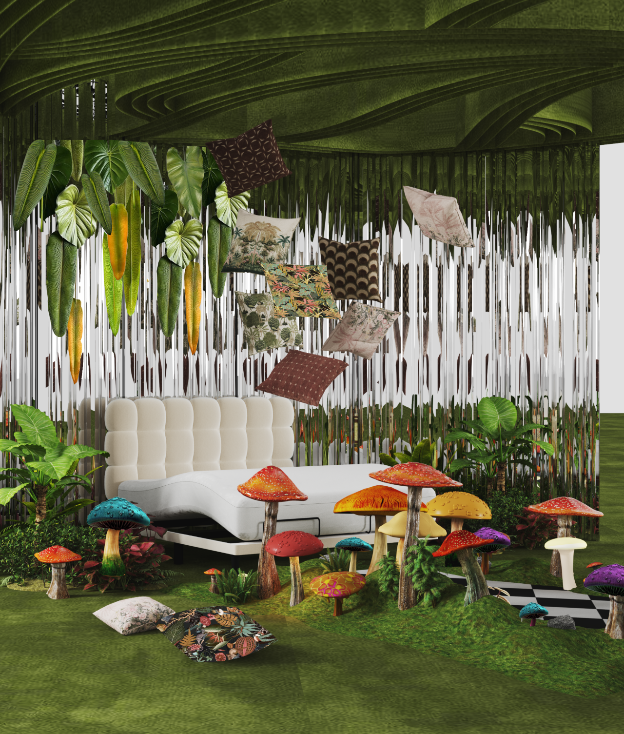 去年参与策展的设计师郑蒙丽和葛露佳,今年依然深度参与,除了联合PUMEI朴美和MAEATTI地球森林两家品牌联合打造了一场人与自然的故事特别展区外,她们还参与了由TEMPUR泰普尔和MLESUN美勒森品牌组成的适老主题展区与设计师陆子彧,李宣吉合作设计。适老展区的设计理念是通过戏剧化述说打破传统“适老”产品的固定想象。他们以逻辑与无逻辑的碰撞为主题,创造了一个类似爱丽丝梦游仙境。